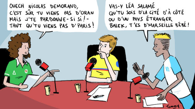 Plus sérieux, Kevin, lui, amène les jeunes à raconter ce qu’ils ont fait le matin. Car, pour se faire la main, les reporters en herbe ont sillonné le quartier pour demander aux gens d’où ils venaient. Comme le raconte Samy, « ici, il y a des gens qui viennent d’Espagne, d’Italie, d’Algérie, de Tunisie, de Roumanie… » Un sacré mélange. Qui resurgit inévitablement quand on cause foot ou même quartier. Haro, évidemment, sur le PSG qui, dans la cité, n’a pas droit de citer. Mais, autour de la table, le fait de porter un survêt du club de « Septèmes-les-Vallons » peut attirer les tacles. Rien de méchant. Mais quand même…