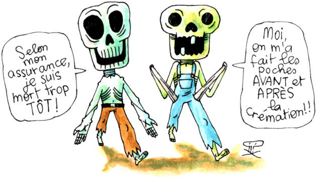 Elle rappelle aussi que « le funéraire bouge très lentement, [c’est] un marché de routine ». Certains cherchent pourtant à innover. Des cercueils en carton, plus écolos, sont désormais à disposition ; il est également possible de se faire fabriquer une urne ou une plaque personnalisée ; ou encore, de faire disperser ses cendres par drone. Certains sites Internet proposent également d’assister les familles ou, mieux, d’enregistrer un message vidéo posthume pour leurs proches. On imagine volontiers la grand-mère rigolarde : « J’ai légué l’assurance vie à la CGT mes petits chéris ! »