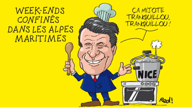 Première en France : Nice et la Côte d’Azur sont confinés le Week-end, du vendredi 18 heures au lundi 6h00. Christian Estrosi, le maire LR de Nice, s’enthousiasme. Jean Léonetti, le maire LR d’Antibes, dénonce les conséquences « familiales, économiques, sociales » d’une mesure « à l’impact sanitaire léger ». Vu par Red !