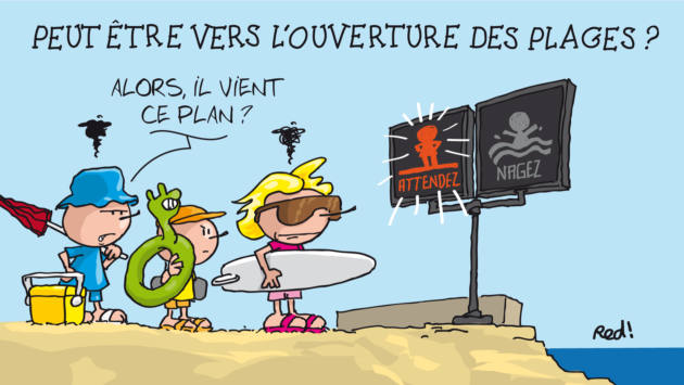 Alors que les baignades et promenades sont autorisées depuis samedi 16 mai, dans le Var, les Alpes-Maritimes, l’Hérault, elles restaient encore partout interdites dans les Bouches-du-Rhône ce mercredi (Réouverture progressive à partir du 21 mai, liste complète des plages autorisées publiée par la préfecture : C.P. Accès au littoral et activités de plaisances dans les Bouches-du-Rhône) ! A Marseille, la mairie ne prévoit pas de réouverture avant le 2 juin… Une galéjade croquée par Red !